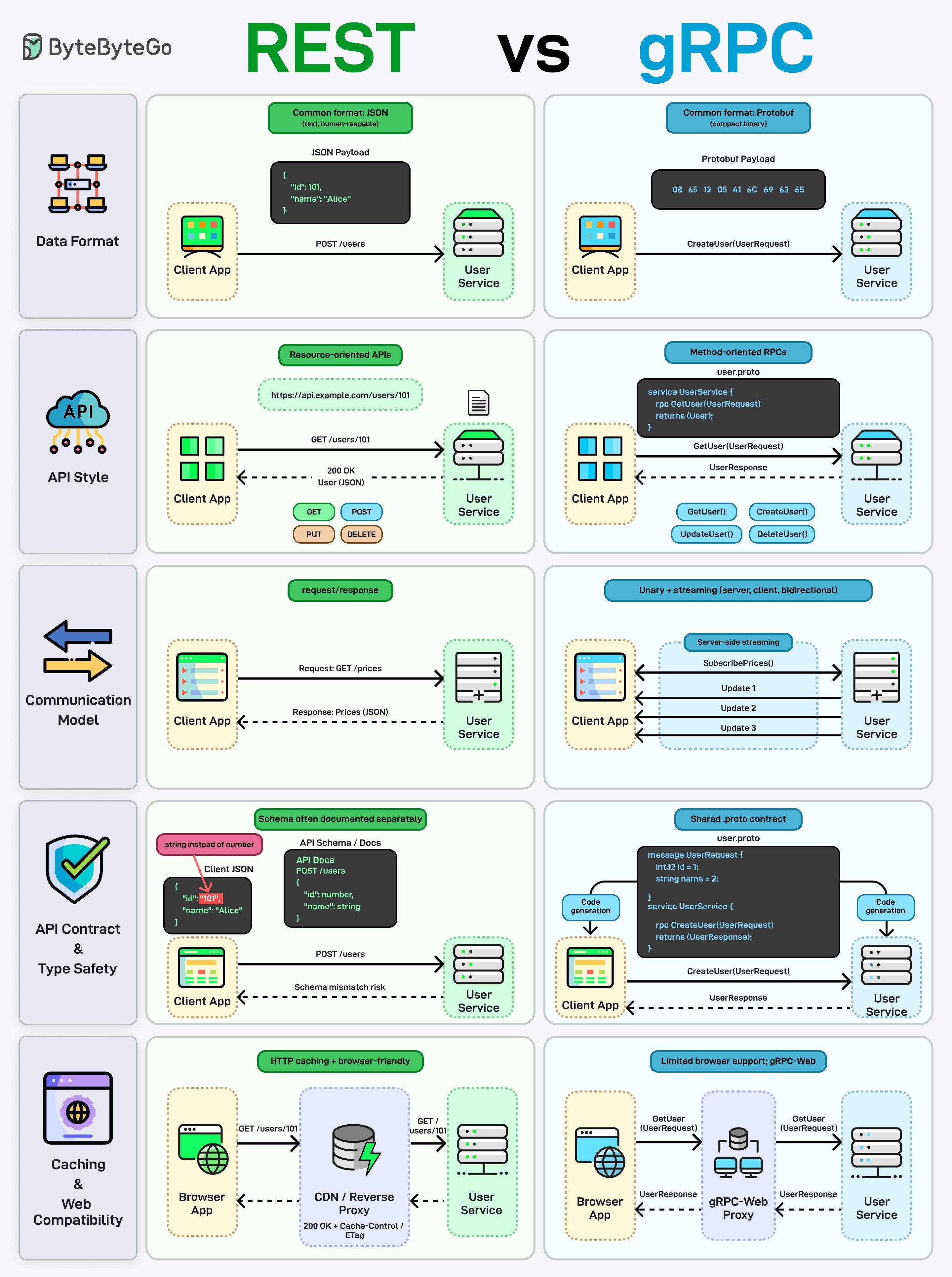 gRPC has limited browser support (usually via gRPC-Web) and doesn’t naturally fit with HTTP caching.