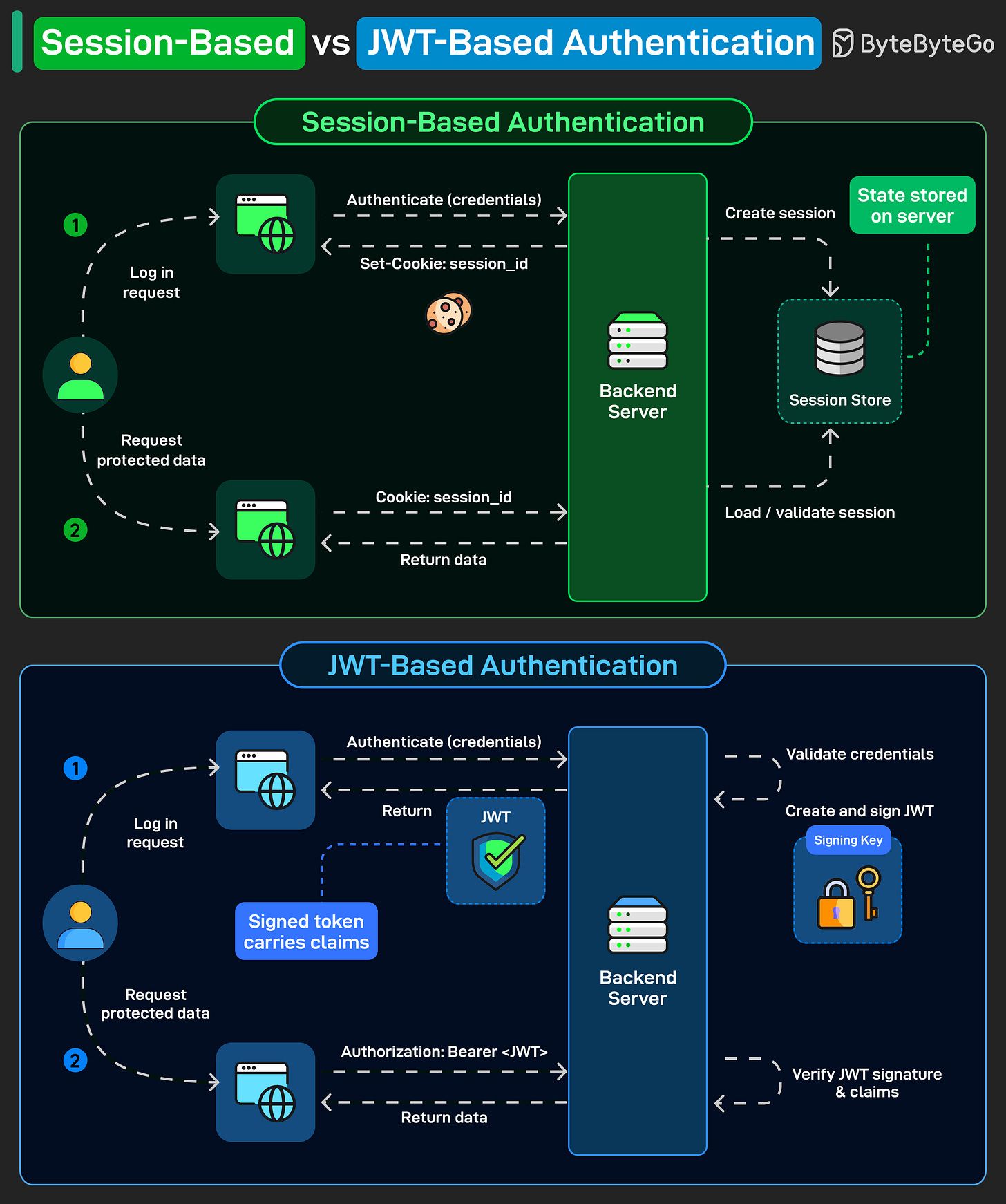 Session-Based Authentication: The user logs in, and the server creates a session and stores it in a session store. The client gets a session_id cookie. On every subsequent request, the browser sends that cookie, and the server looks up the session to validate it.